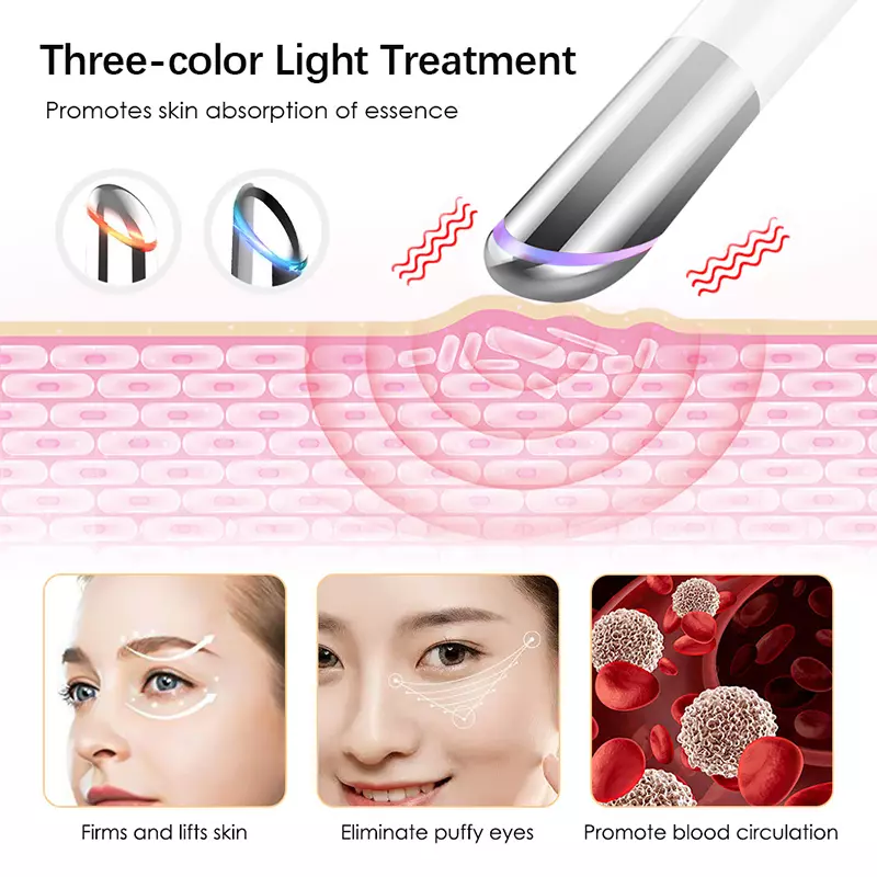 1. Color light eye beauty instrument, blue light high-frequency vibration massage, reduce oil secretion, sterilize, open pores, introduce eye cream essence, fade eye bags, fade dark circles;